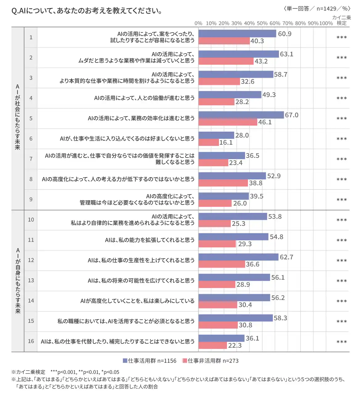 仕事活用群はAIのもたらす未来をポジティブに捉える一方、危機感も抱いている |