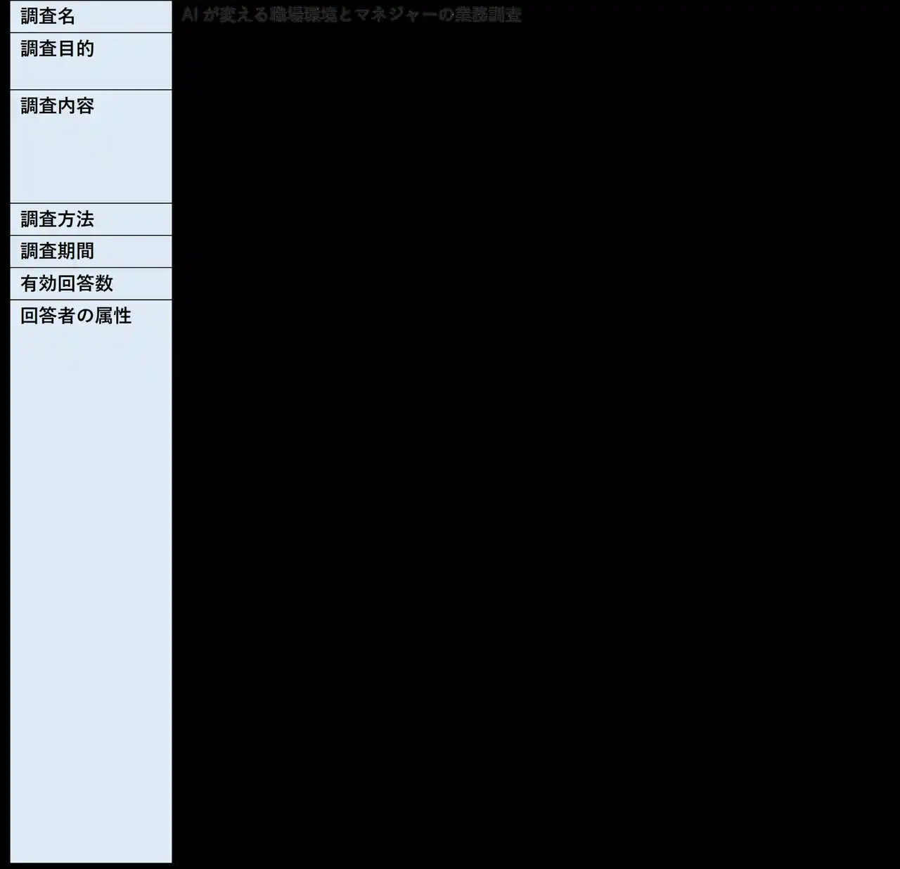商品・サービス、業務プロセスといった事業におけるAI活用に関するニュースを日々見聞きします。また、働く人のAI活用も進み、職場やマネジメント業務にも変化が表れてきている状況を受けて、本調査を実施しました。 |