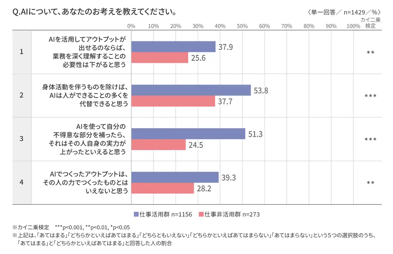 ・仕事活用群においても、AIによる成果をそのまま個人の能力とみなすことには慎重な見方が存在している。 |