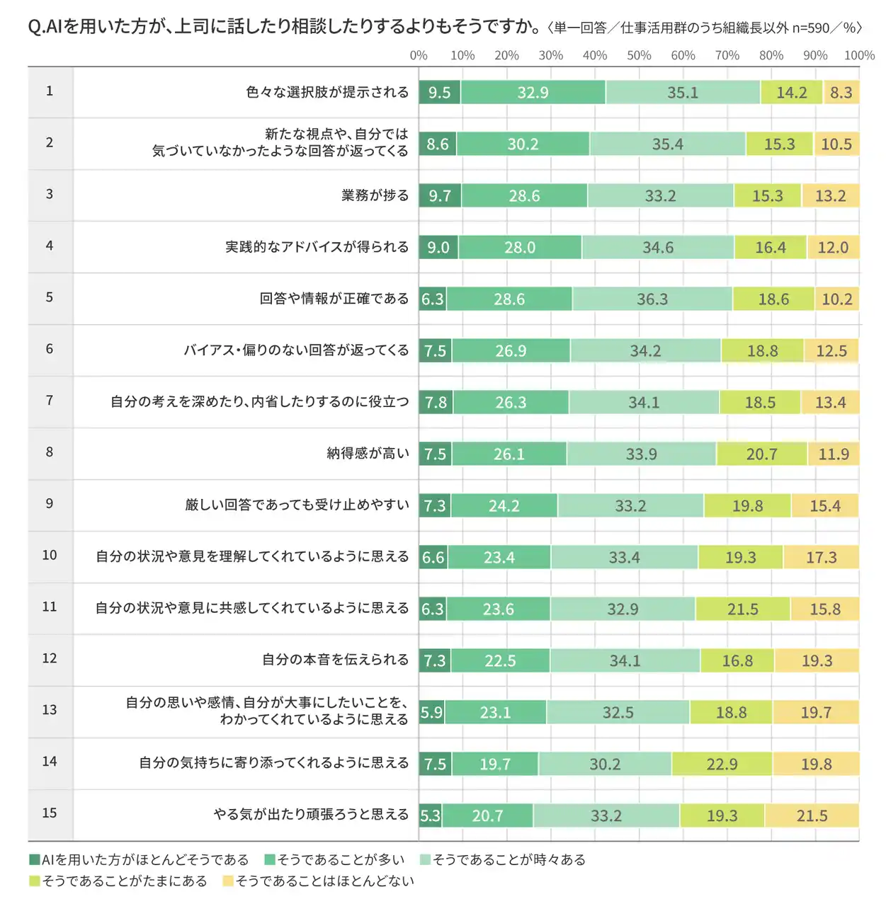 ・一方で、「やる気の喚起(15)」はAIの肯定回答率が26.0%に対し上司40.8%、「気持ちへの寄り添い(14)」はAI 27.2%に対し上司42.7%、「価値観や感情の理解(13)」はAI 29.0%に対し上司38.5%と、感情や内面への関与では上司が上回る結果となった。 |