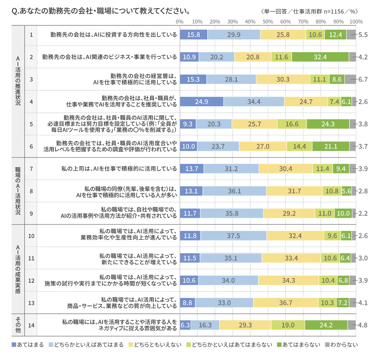 ・職場レベルでは、「上司が活用(7)」の肯定回答率が44.9%、「同僚が活用(8)」49.2%、「活用事例・方法の共有(9)」47.5%と、いずれも約半数でAI活用が進んでいる。 |