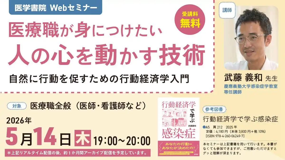 | 株式会社医学書院 (所在地:東京都文京区、代表取締役社長:金原 俊)は、医師や看護師など、医療職の方々に向けて無料Webセミナー『医療職が身につけたい 人の心を動かす技術~自然に行動を促すための行動経済学入門』を2026年5月14日(木)19:00~20:00に開催します。 | ||||||||||||||