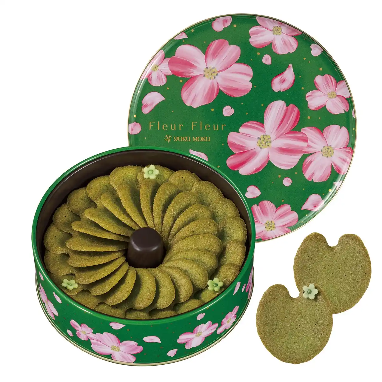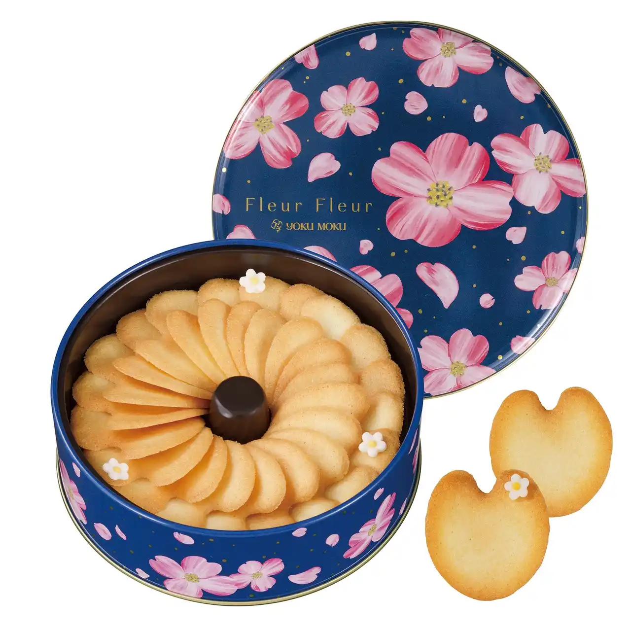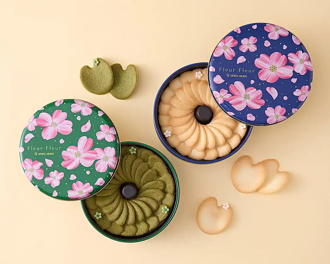 | 「フルール・フルール」は缶デザインがリニューアル。ヨックモックのシンボルフラワーである“ハナミズキ”が空から、はらはらと舞い降りてくる様子をデザインに込めました。 | |||||||||