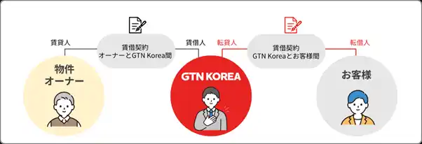GTNが物件を借り上げ、お客様に転貸(サブリース)することで、日本本社名義での契約を可能にし、高額な保証金の管理リスクを抑えます。 |