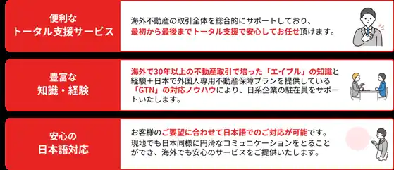 GTN Koreaは、世界各国で不動産賃貸仲介業を展開する株式会社エイブルとの協力体制と、韓国の国家資格「公認仲介士(日本の宅地建物取引士相当)」による厳格な物件審査のもと、以下のソリューションを提供します。 |