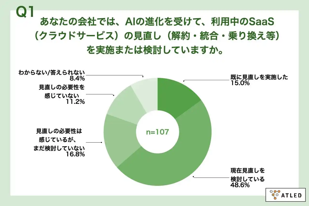 「Q1. あなたの会社では、AIの進化を受けて、利用中のSaaS(クラウドサービス)の見直し(解約・統合・乗り換え等)を実施または検討していますか。」