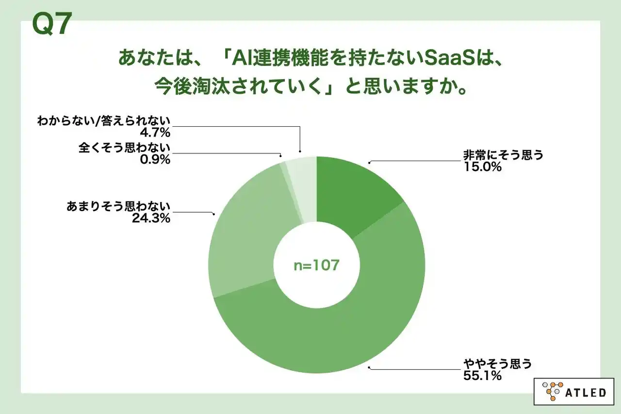 「Q7. あなたは、「AI連携機能を持たないSaaSは、今後淘汰されていく」と思いますか。」(n=107)と質問したところ、「非常にそう思う」が15.0%、「ややそう思う」が55.1%という回答となりました。 |