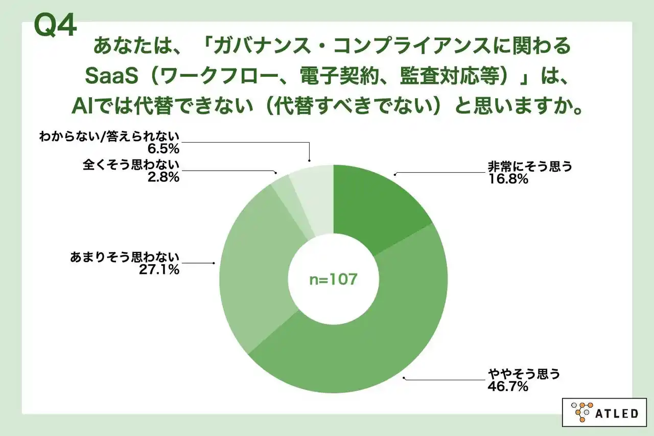 Q4. あなたは、「ガバナンス・コンプライアンスに関わるSaaS(ワークフロー、電子契約、監査対応等)」は、AIでは代替できない(代替すべきでない)と思いますか。 |