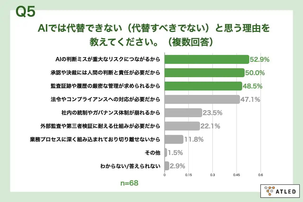 「Q5. Q4で「非常にそう思う」「ややそう思う」と回答した方にお聞きします。AIでは代替できない(代替すべきでない)と思う理由を教えてください。(複数回答)」(n=68)と質問したところ、「AIの判断ミスが重大なリスクにつながるから」が52.9%、「承認や決裁には人間の判断と責任が必要だから」が50.0%、「監査証跡や履歴の厳密な管理が求められるから」が48.5%という回答となりました。 |