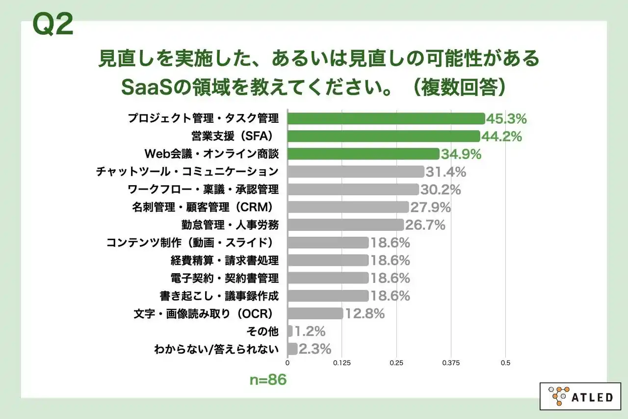 「Q2. Q1で「既に見直しを実施した」「現在見直しを検討している」「見直しの必要性は感じているが、まだ検討していない」と回答した方にお聞きします。見直しを実施した、あるいは見直しの可能性があるSaaSの領域を教えてください。(複数回答)」(n=86)と質問したところ、「プロジェクト管理・タスク管理」が45.3%、「営業支援(SFA)」が44.2%、「Web会議・オンライン商談」が34.9%という回答となりました。 |