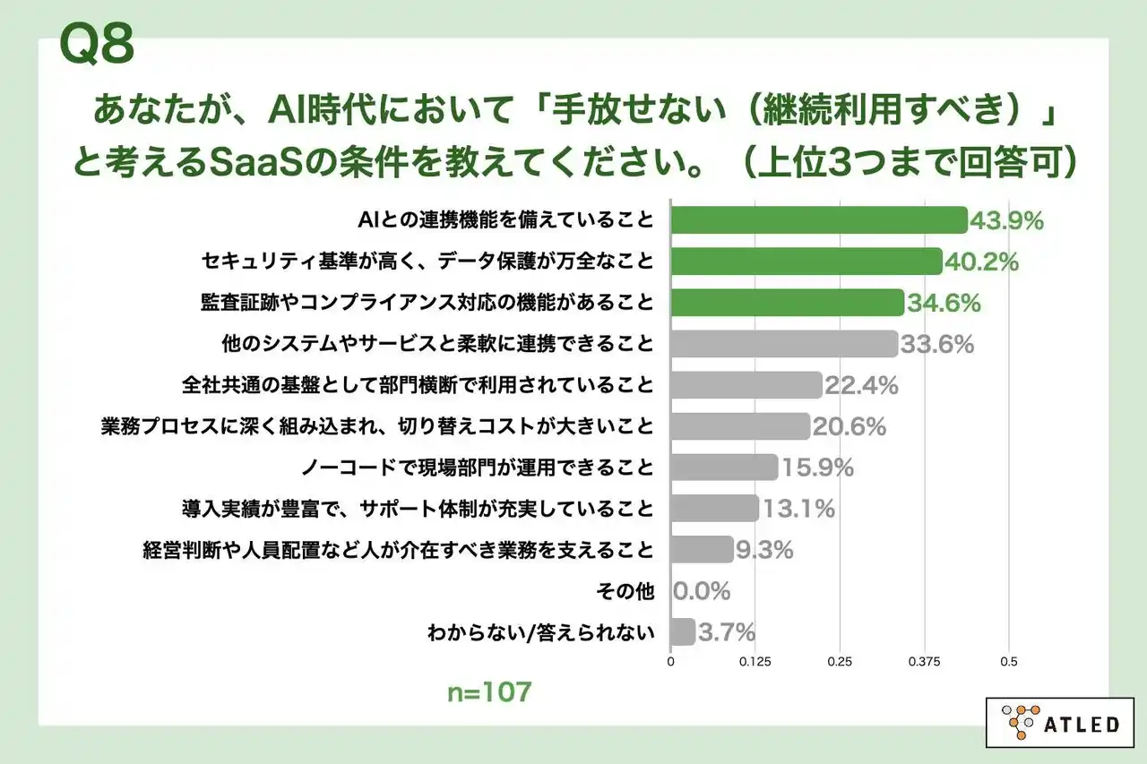 「Q8. あなたが、AI時代において「手放せない(継続利用すべき)」と考えるSaaSの条件を教えてください。(上位3つまで回答可)」(n=107)と質問したところ、「AIとの連携機能を備えていること」が43.9%、「セキュリティ基準が高く、データ保護が万全なこと」が40.2%、「監査証跡やコンプライアンス対応の機能があること」が34.6%という回答となりました。 |