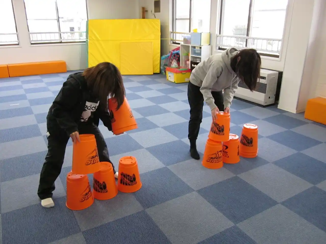 | 近年導入が進む「ジャンボスタッキング」は、通常よりも大きなカップを使用し、身体全体を使って楽しめるレクリエーション型プログラムです。 | ||||||||