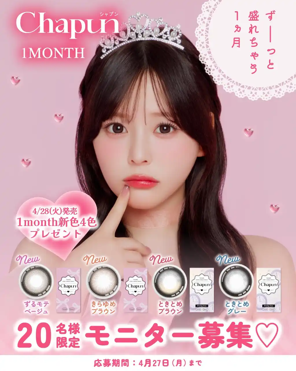 | 『Chapun』マンスリーレンズ発売を記念して、ご自身のSNSアカウントにてレビュー投稿いただける方に4月28日(火)発売のマンスリーレンズ全4色を各1箱ずつプレゼントいたします。 | |||||||||||||