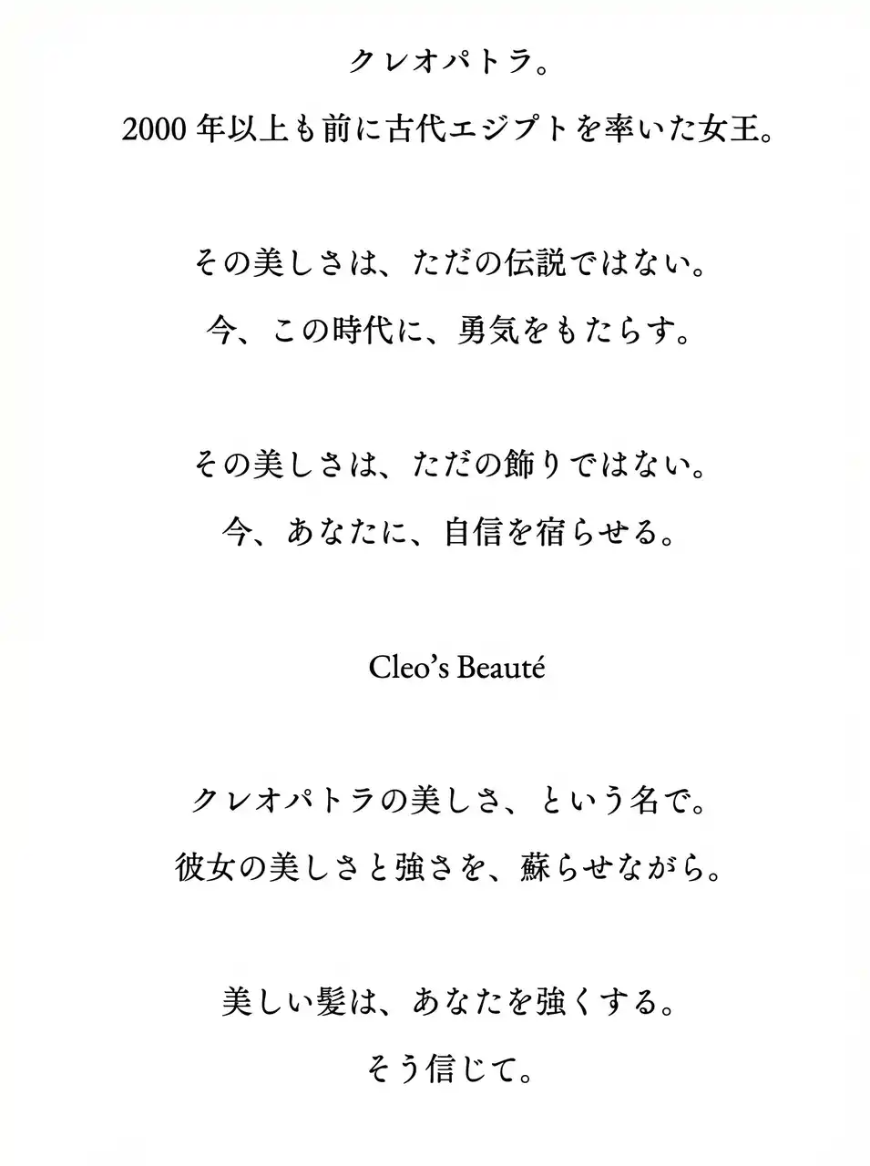 2000年以上も前に古代エジプトを率いた女王・クレオパトラ。彼女が持つ、単なる伝説に留まらない美しさと強さを、現代に生きる人々の自信へと繋げたいという想いから、「美しい髪は、私を強くする」というブランド理念をさらに深化させるためリブランディングに至りました。 |