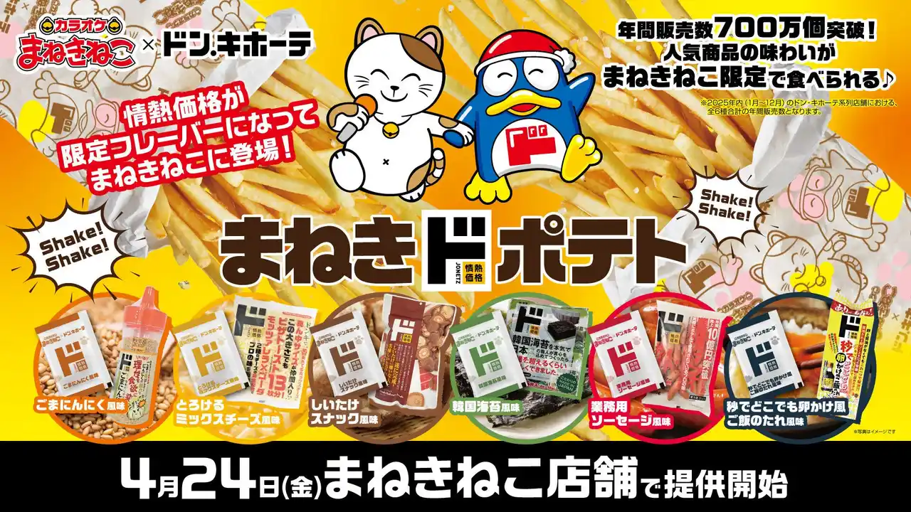 株式会社コシダカホールディングス(東京本社:東京都渋谷区、代表取締役社長:腰高 博)傘下の株式会社コシダカが運営する「カラオケまねきねこ」は、株式会社パン・パシフィック・インターナショナルホールディングス(本社:東京都渋谷区、代表取締役社長 CEO:森屋 秀樹、以下PPIH)が展開するドン・キホーテのオリジナルブランド「情熱価格」とのコラボレーション『まねきドポテト』を2026年4月24日(金)よりカラオケまねきねこ全店 ※1で期間限定販売いたします。 |