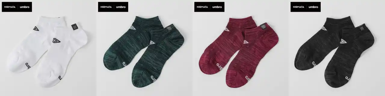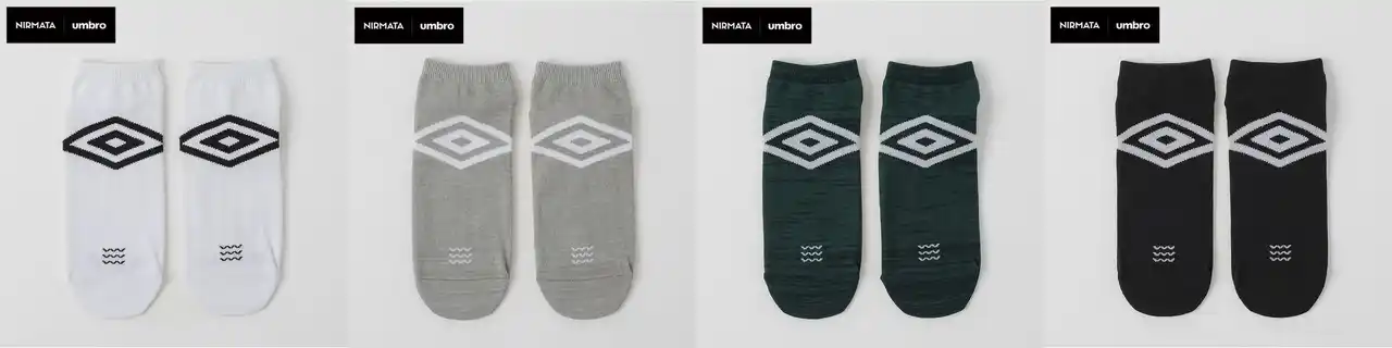 ニルマータはイオンとトップスタイリスト熊谷隆志氏がコラボした、「自分がほんとに好きなもの…」をテーマにトレンドを発信し、色と柄を特長とするブランドです。今回のUMBROとのコラボソックスではスタイリッシュなスポーツスタイルを提案し、サッカーシャツのような光沢感のある素材に両ブランドのロゴをデザインしています。シロやクロなどのベーシックなカラーの他にも、差し色として使えるアカやピンクも品揃えし、足元をおしゃれに彩ります。 |