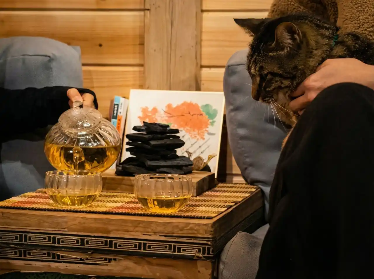 五感を整える体験(特製ダレのための胡麻・大根おろし、台湾茶、漢方の物語カード、猫の書籍) |
