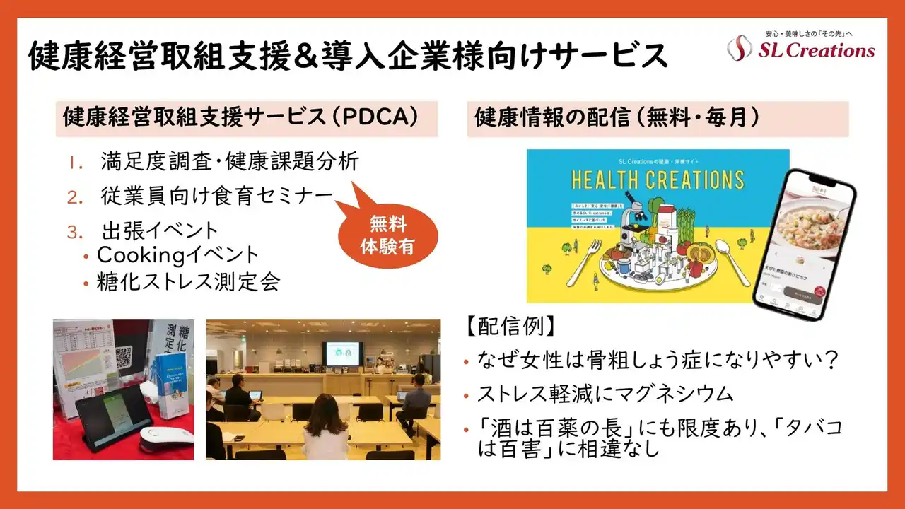 株式会社SL Creations(本社:東京都大田区羽田、代表取締役社長:佐藤健)は、自社の社食サービス『Office Premium Frozen(オフィスプレミアムフローズン)』を活用した職場での研究において、糖化ストレス指標(SAF)の低下を確認しました。本成果は英文査読論文として掲載されています。 |