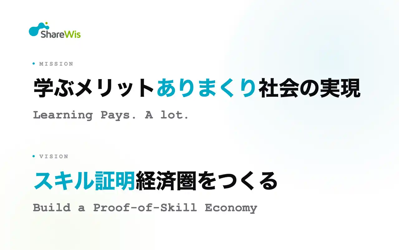 当社は本ミッション・ビジョンのもと、スキル証明の発行・流通を支えるインフラとしての事業を推進し、学んだことが正当に評価され、個人のスキルが資産として循環する社会の実現を目指します。 |