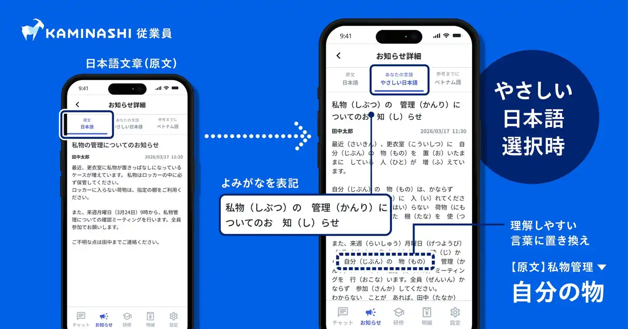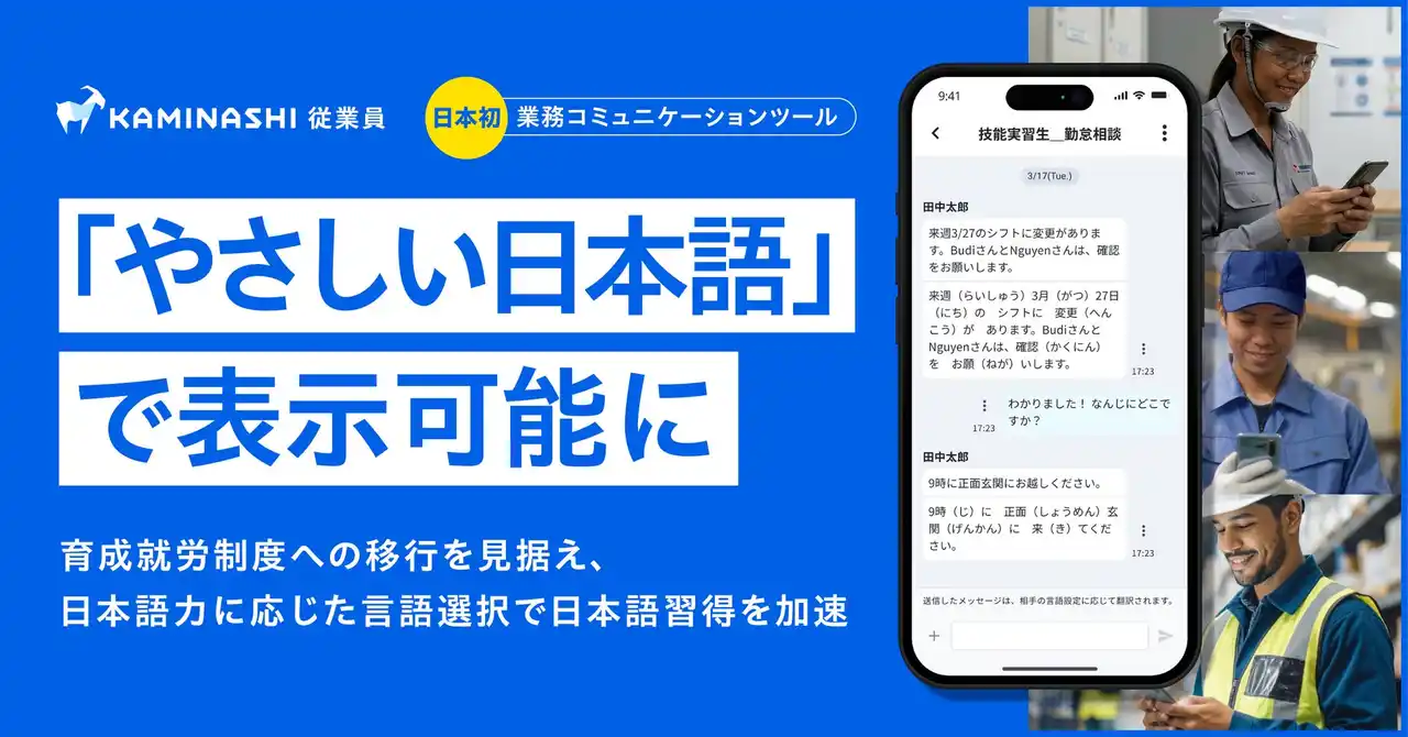 株式会社カミナシ(本社:東京都千代田区、代表取締役CEO:諸岡 裕人、以下「カミナシ」)が開発・提供する『カミナシ 従業員』は、ビジネスコミュニケーションツールとして日本初(※1)となる「やさしい日本語」表示機能を追加しました。本機能により、技能実習生や特定技能外国人などの外国人材は、自身の日本語力に応じて「母国語」「やさしい日本語」「日本語」から最適な言語を選択できるようになります。働きながら日本語を習得できる環境を整えることで、現場における「言葉の壁」を解消し、より円滑な意思疎通を実現します。 |