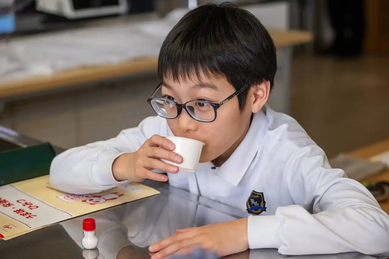 授業では、「あなたは、あなたが食べたものでできている」という言葉をキーワードに、食べものと体の関係について解説しました。続いて、おいしさを感じるための5つの基本味の1つであるうま味の役割について学びました。うま味はだしを味わうときに感じる味であり、昆布やかつお節にも含まれています。児童たちは小瓶入りのうま味調味料を使い、薄味の味噌汁にうま味を加える前後でどのように味が変化するかを体験しました。