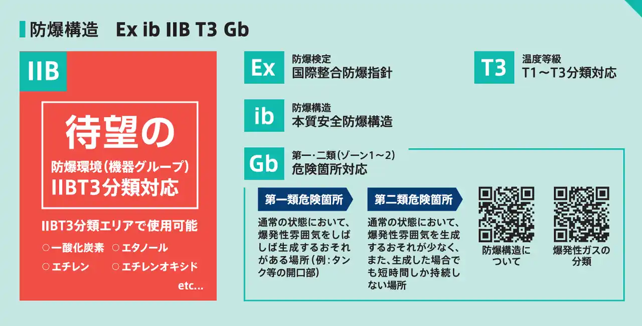 防爆機器とは 石油精製・石油化学・化学プラントなど、常に可燃性ガス(爆発性ガス)が発生しているまたは発生する恐れのある場所で、機器そのものが発火元となって爆発事故を起こさないように作られた機器です。 防爆にはいくつかの分類があり、適用する危険箇所や可燃性ガスの種類が異なります。 |
