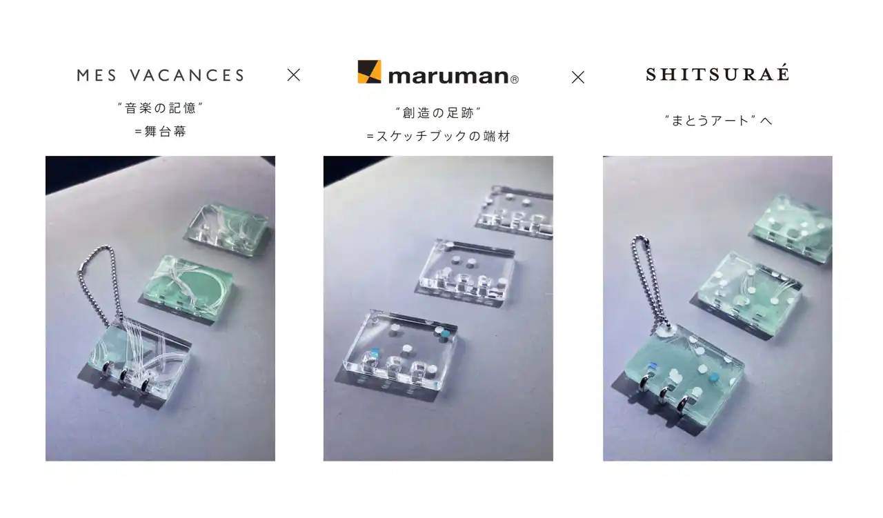 | 今回、スペシャルアイテムとして<MES VACANCES・SOUZO・SHITSURAE> の3ブランドによるトリプルコラボレーションとして、オリジナルのスケッチブック型キーチェーンを販売いたします。 | |||||||||
