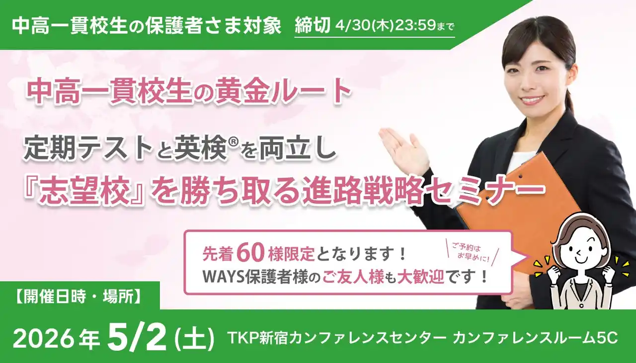 株式会社メイツ(本社:東京都新宿区、代表取締役:遠藤尚範)が運営する「中高一貫校専門 個別指導塾WAYS」は、2026年5月2日(土)にTKP新宿カンファレンスセンターにて、中高一貫校生の保護者さまを対象とした無料セミナー「中高一貫校生の黄金ルート 定期テストと英検(R)を両立し『志望校』を勝ち取る進路戦略セミナー」を開催いたします。 |