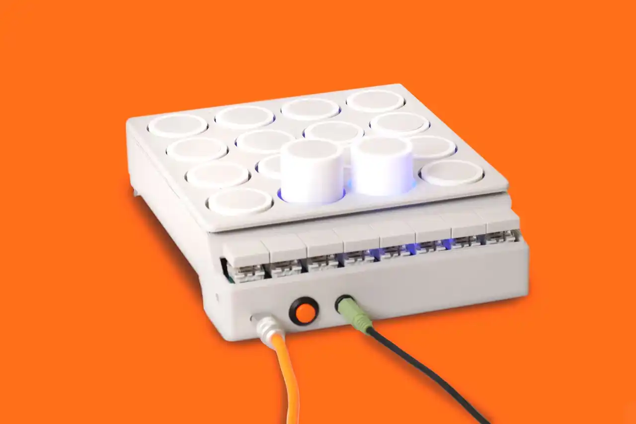 音に合わせてボタンが飛び出すことで、音を耳だけでなく目で見て手で触れられる楽器ロボットです。アプリと接続することでAIとの協奏を行うインターフェイスとしても機能します。 |