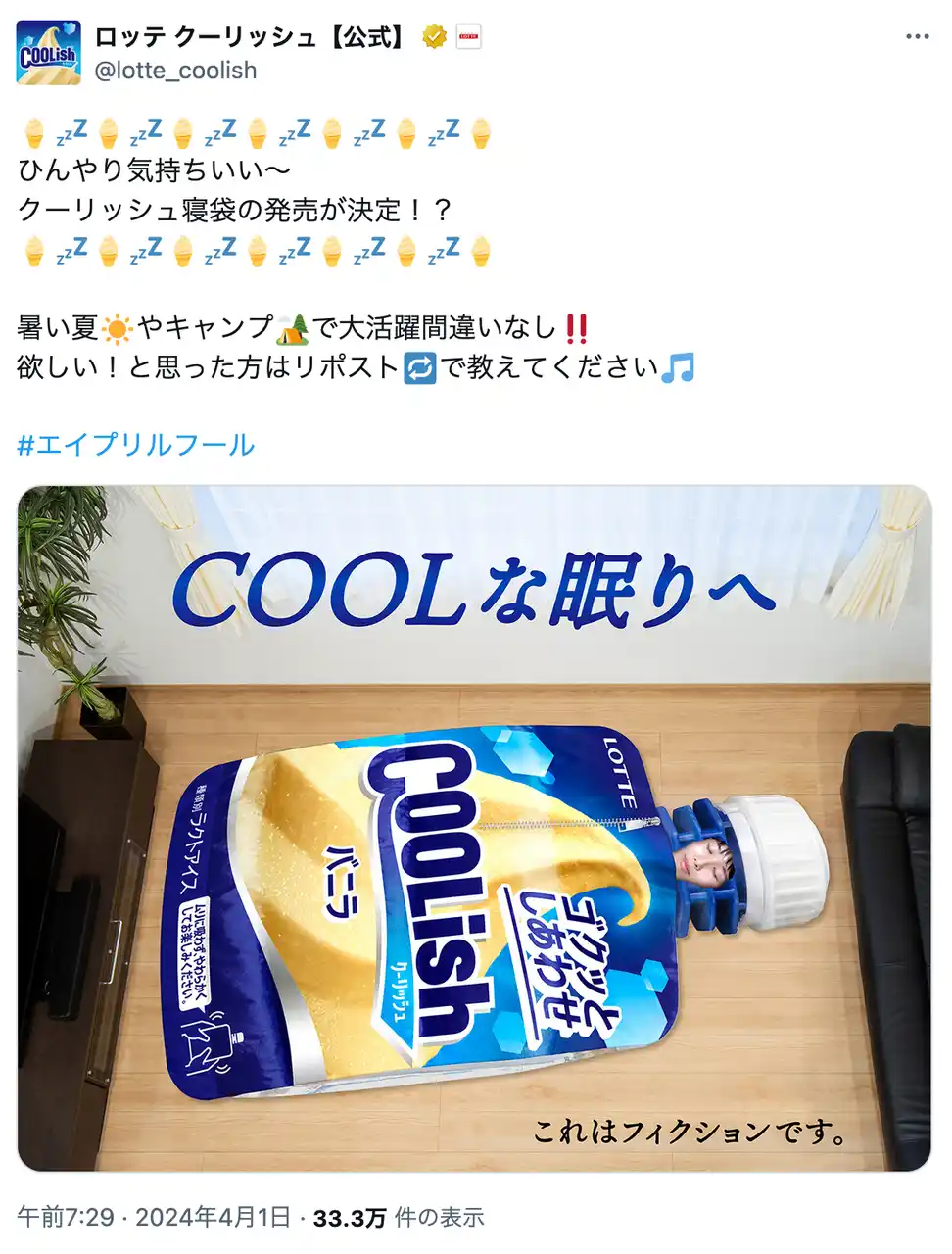 | 「クーリッシュ寝袋」は2024年のエイプリルフールに投稿したネタを具現化したもので、是非皆さまに「クーリッシュ」の気持ちになって、「クーリッシュ」を飲んでほしいという願いを込めて、今回作成させて頂きました。 | |||||||||||||||||||