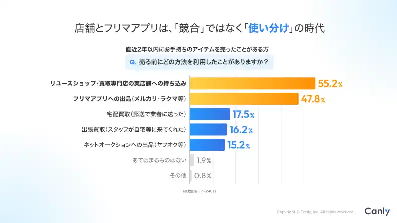 | 最新調査の結果、店舗とフリマアプリは目的にあわせて使い分けられていることがわかりました。 | |||||||||||