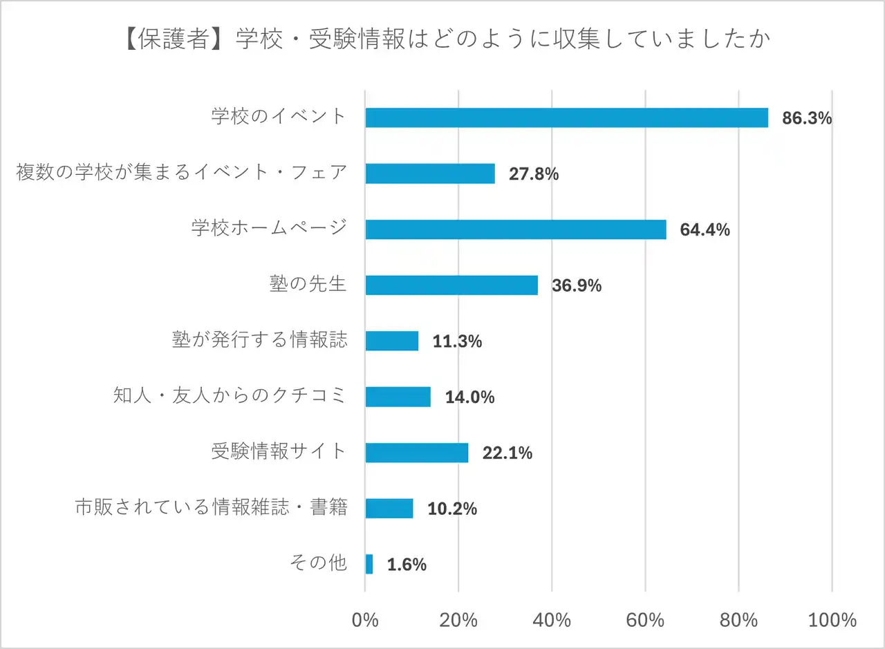 保護者に、学校や受験情報をどのように収集していたか聞いたところ、「学校のイベント」が86.3%と最も多く、次いで「学校ホームページ」が64.4%となった。多くの家庭で、学校が発信する情報を活用していることが分かった。 |