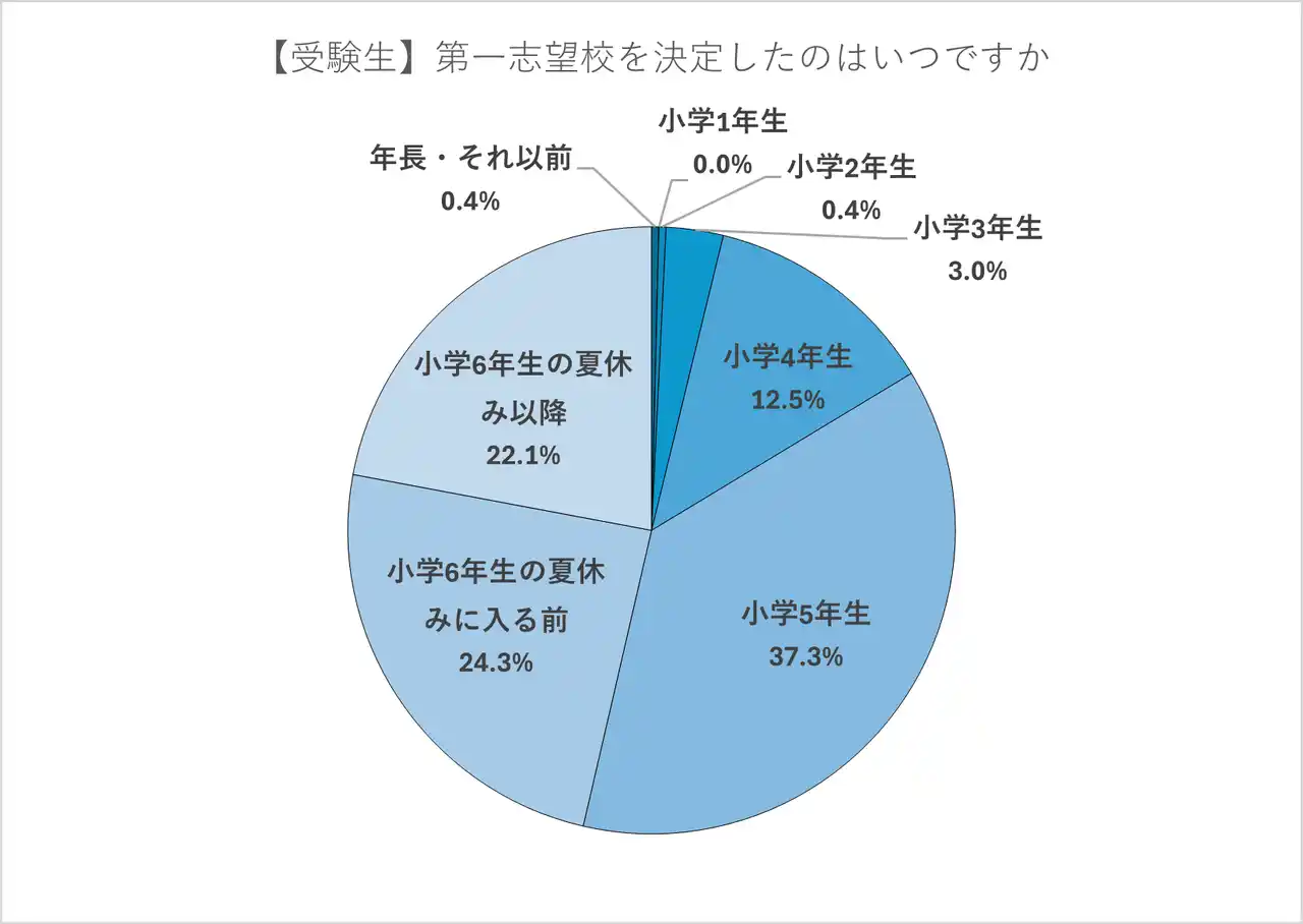第一志望校を決めた時期を受験生に聞いたところ、「小学5年生」が37.3%と最も多かった。次いで「小学6年生の夏休みに入る前」が24.3%、「小学6年生の夏休み以降」が22.1%と続いた。受験生の3人に1人以上が小学5年生で第一志望校を決めたものの、小学6年生になってから志望校を決定した受験生も約半数であることが分かった。 |