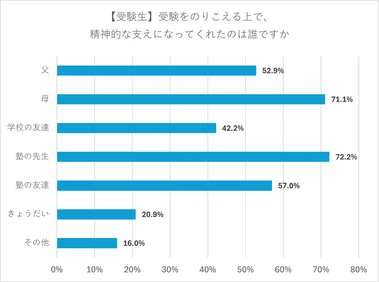 受験生に、受験をのりこえる上で精神的な支えとなった人を聞いたところ、「塾の先生」が72.2%と最も高く、次いで「母」が71.1%だった。受験生にとって、周囲の大人が支えとなっていることが分かった。 |