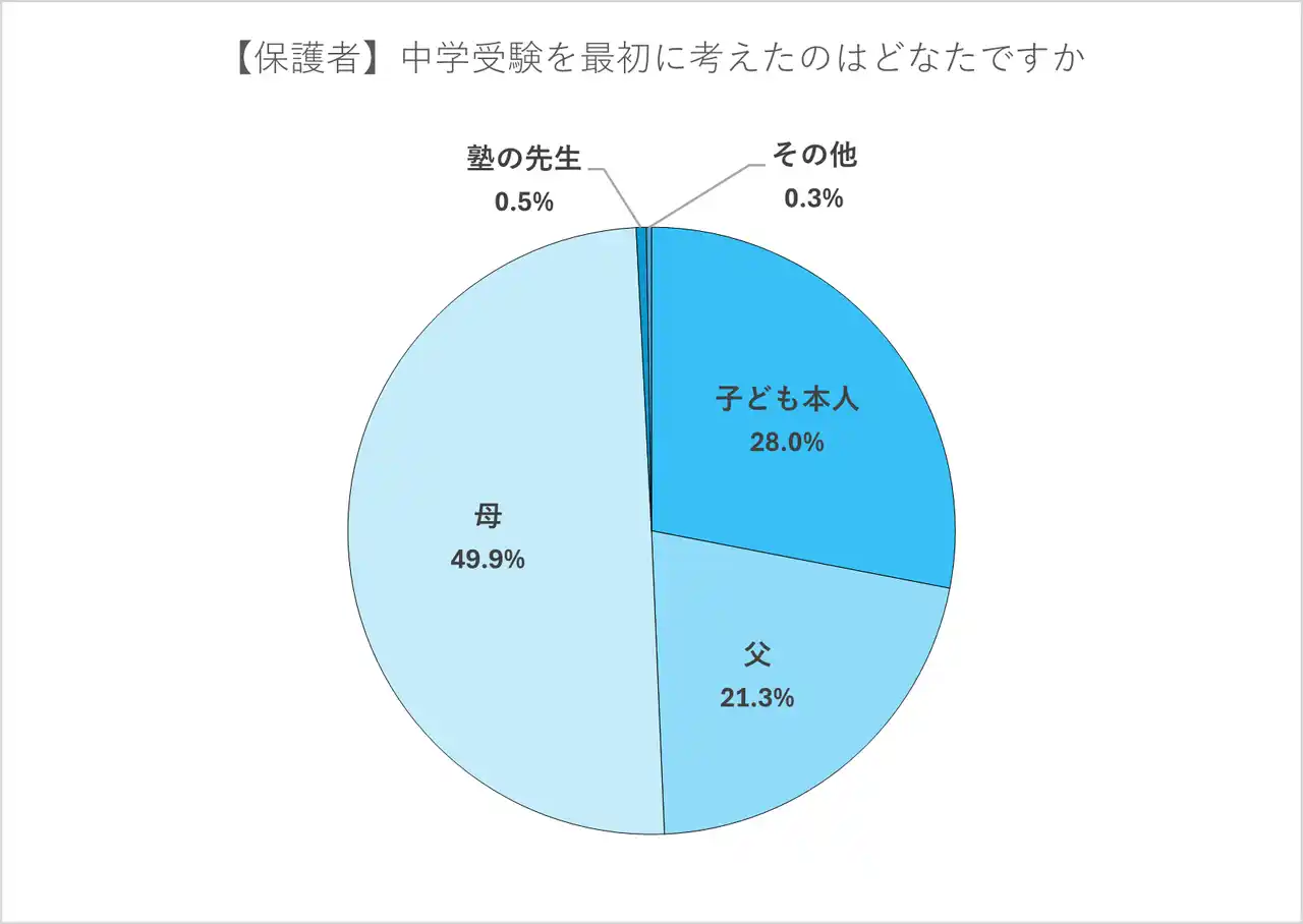 受験生の保護者に、最初に中学受験をしようと考えた人を聞いたところ、49.9%の保護者が「母」と回答した。次いで、「子ども本人」が28.0%、「父」が21.3%だった。 |