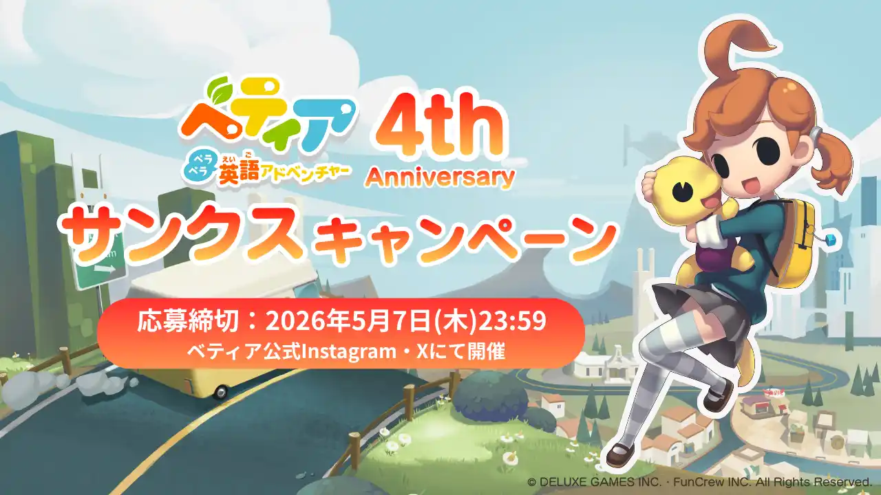 『ベティア ペラペラ英語アドベンチャー』発売4周年を記念して、公式XとInstagramにて、フォロー&リポストによるプレゼント企画「べティア 4th Anniversary サンクスキャンペーン」を実施いたします。 |