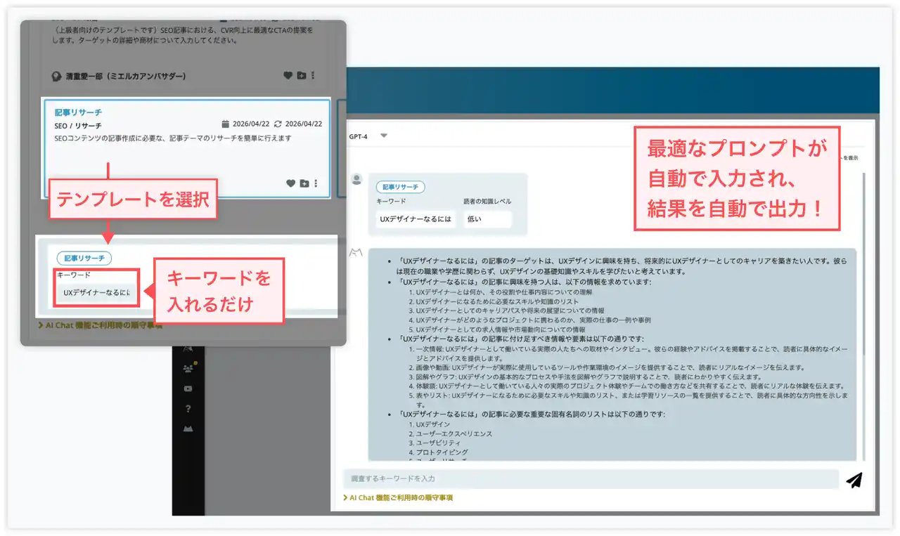 | 入力内容をテンプレートとして保存し、繰り返し利用することが可能です。ユーザーは同じプロンプトを毎回入力する必要なく、一度作成したテンプレートを使用して効率よく作業を進めることができます。また、社内の他のユーザーにもプロンプトのテンプレートを共有できるので、全メンバーが効率的に作業を進められます。 | |||||||||