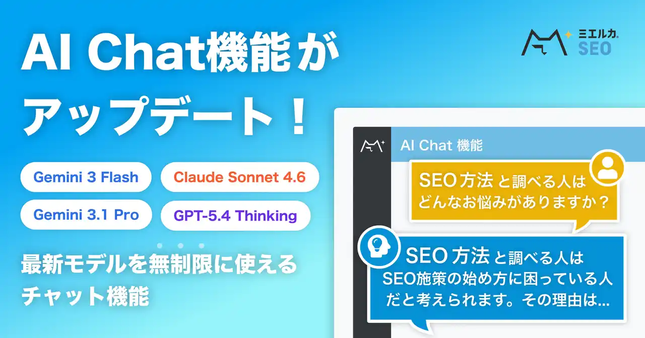 | 「AI チャット機能」のご利用には、ミエルカSEO※をご契約いただくことでご利用いただけます。すでに対象プランをご契約中のお客様は、追加費用なしで最新モデルをご利用いただけます。 | |||||||||