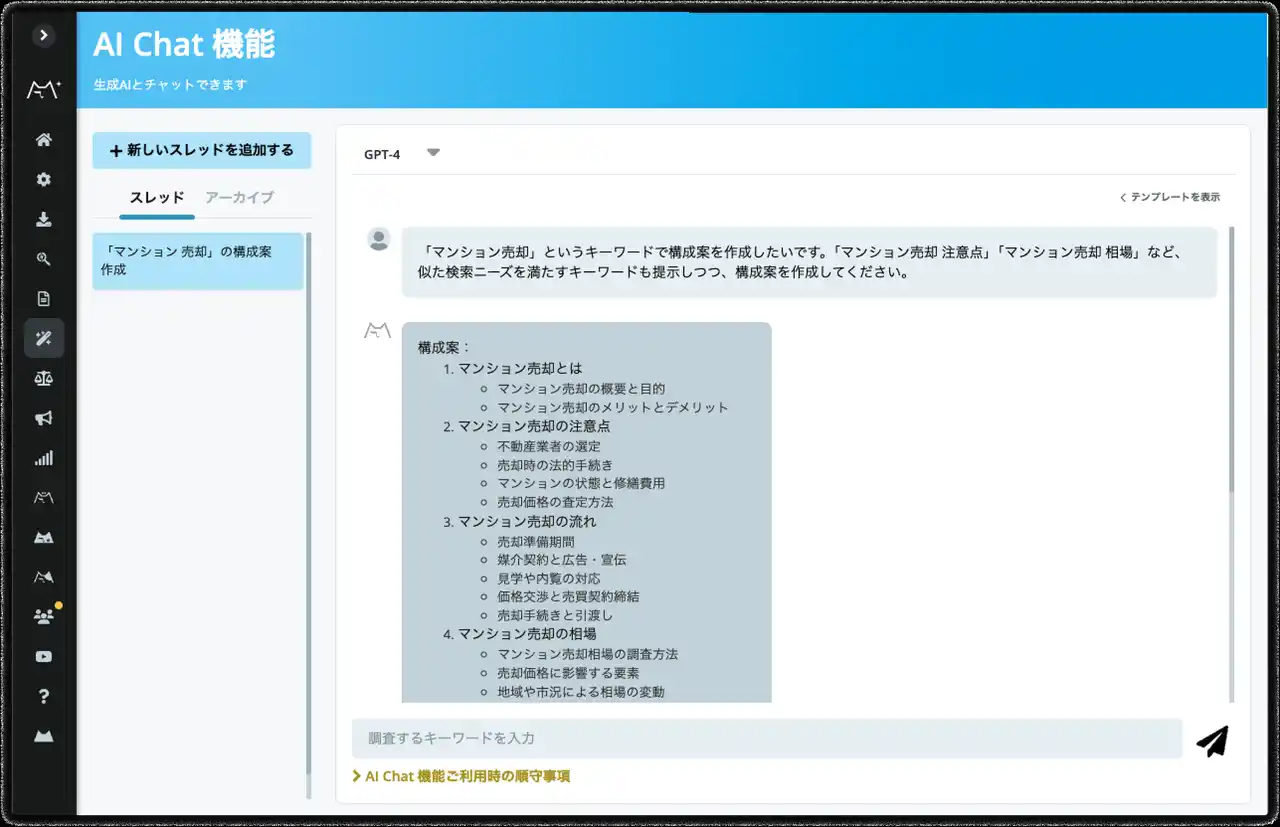 | 本機能は、これまでデジタルマーケティングに特化したAIチャットとして、多くのお客さまにご利用いただいております。今回のアップデートにより、複数の最新モデルに対応することで、SEOリサーチや複雑な文章生成など、マーケティング施策全般をより高精度かつ高速に実行いただけます。 | |||||||||