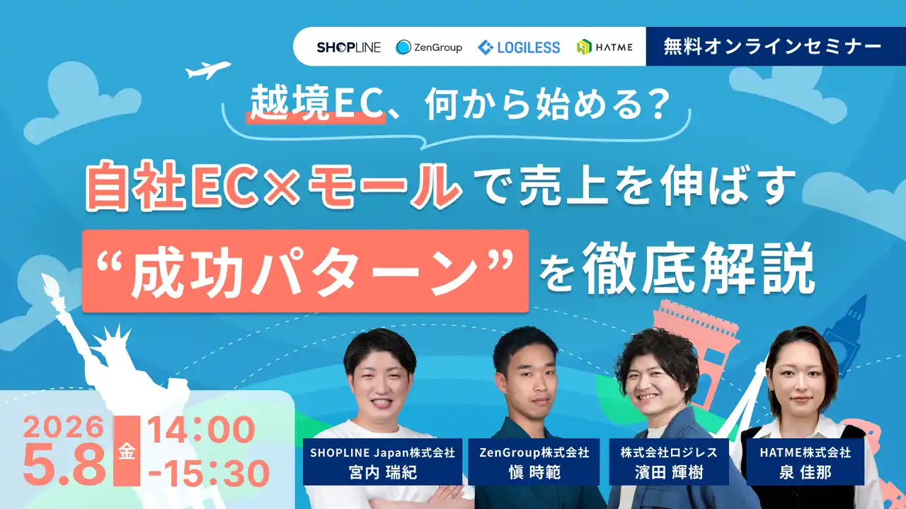 | マーケティングアソシエーション株式会社の子会社であるHATME株式会社(本社:東京都台東区 代表取締役:中園広和、以下当社)は2026年5月8日(金)に、SHOPLINE Japan株式会社、ZenGroup株式会社、株式会社ロジレスと、4社共催ウェブセミナー「越境EC、何から始める? 自社EC×モールで売上を伸ばす“成功パターン”を徹底解説」を、開催いたします。 | ||||||||||||||||