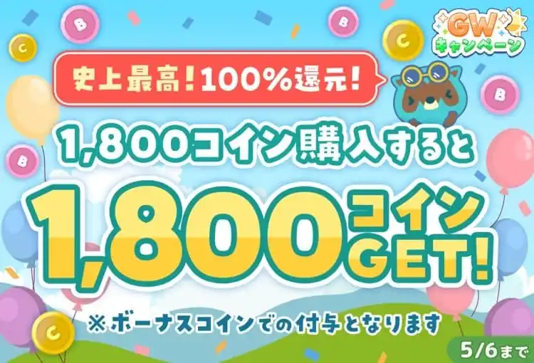| 期間中に 1800 コインを購入すると、1800 ボーナスコインがもらえるお得なタイムセールを開 | |||||||||||||