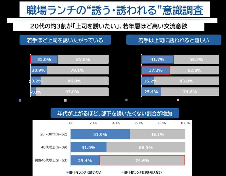 一方、上司世代にあたる40代以上では、自ら声をかけることに対して慎重な姿勢が見られた。「部下をランチに誘いたくない」とする割合は男性40代以上で74.6%に達した。背景には、ハラスメントへの配慮や、部下の負担になりたくないという意識もあると考えられる。 |