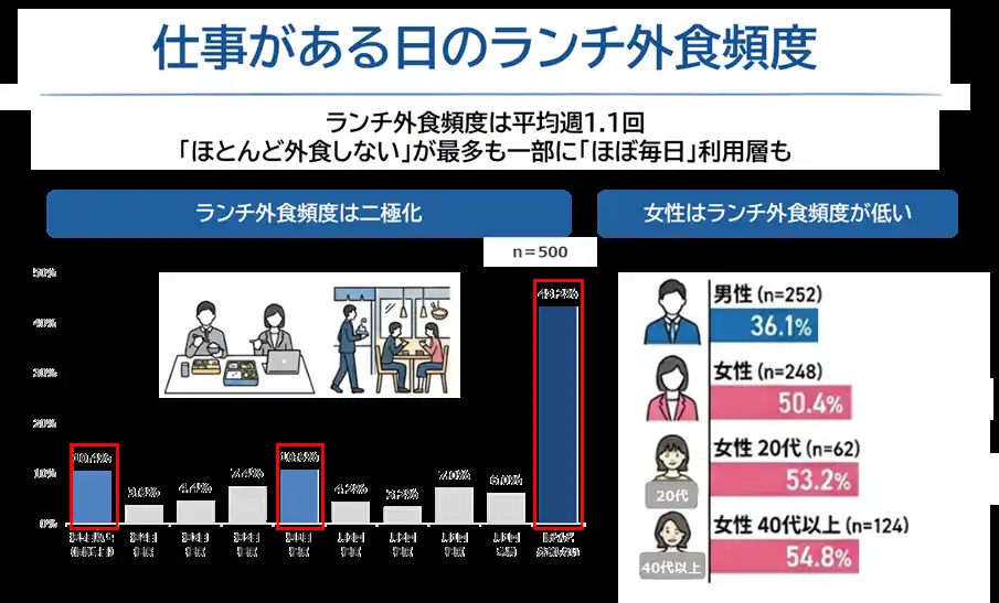■ランチ外食頻度は平均週1.1回、“ほとんど外食しない”が最多も一部に“ほぼ毎日”利用層も |