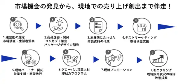 市場調査から商品企画、販路開拓、プロモーション、営業支援、人財育成まで、海外進出の全プロセスを伴走します。従来のように調査会社やコンサルティング会社などで支援が分断される情報ロスを防ぎ、実行フェーズまで責任を持ってサポートします。 |