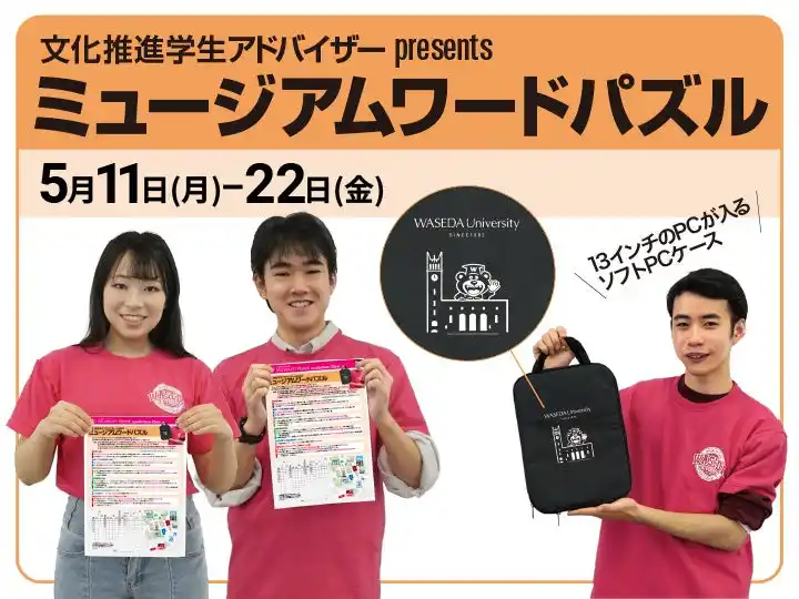 早稲田文化を推進する学生ボランティア「文化推進学生アドバイザー」や早稲田大学漫画研究会が、皆さんにミュージアムを楽しんで巡っていただくために様々なプレゼント企画を用意しました。 |