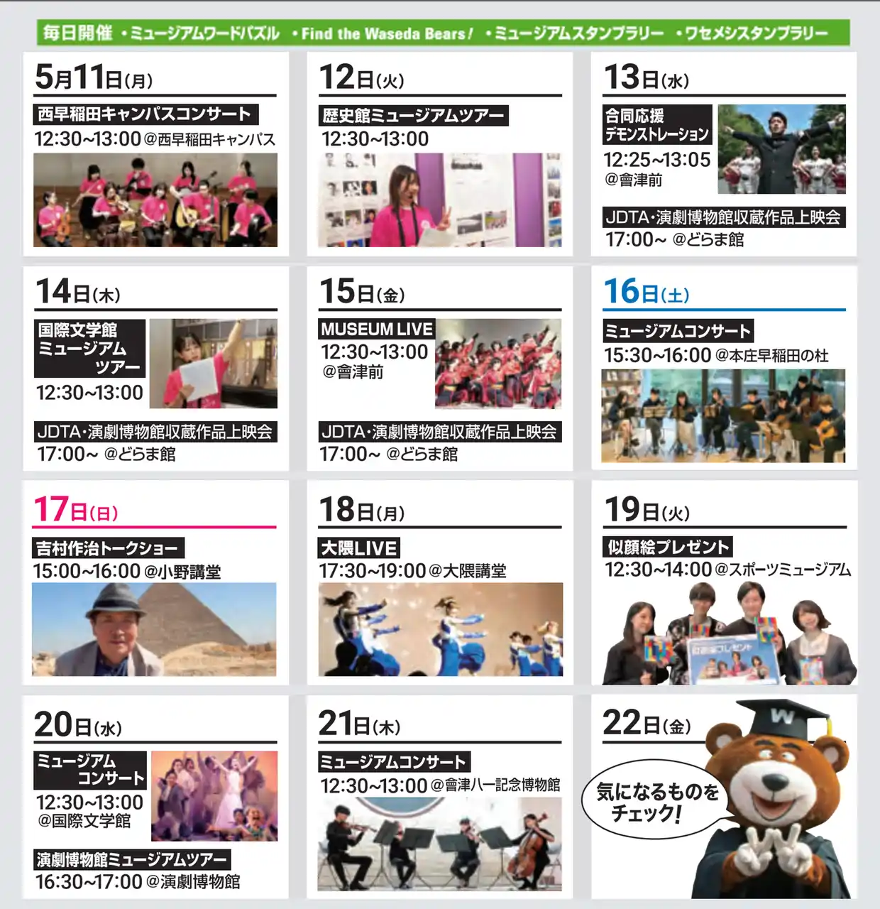 この早稲田大学のミュージアムの魅力を体感するイベント「Museum Week」を、今年も5月11日~22日の期間で開催します。恒例の大隈LIVEやMuseum LIVEをはじめ、各館で様々なイベントを開催します。ぜひお楽しみください! |
