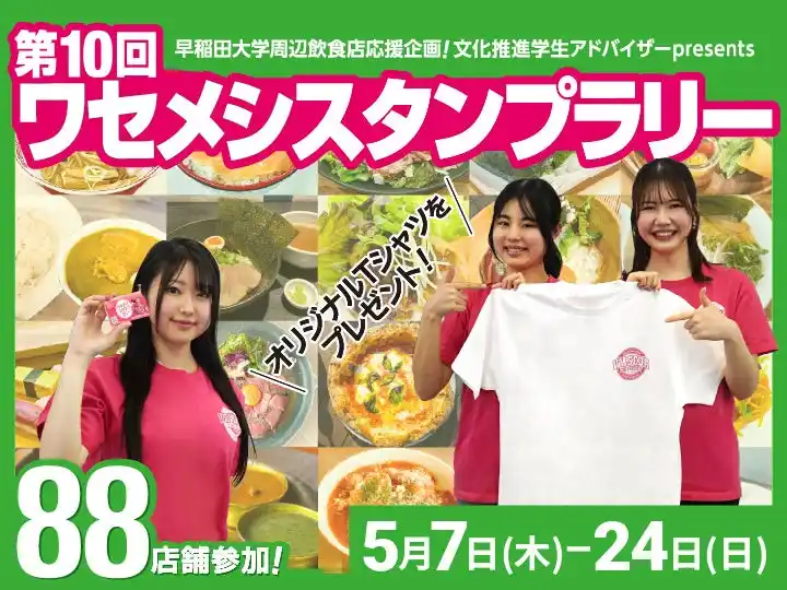 誰でも参加できる、好評のワセメシスタンプラリー。期間中に参加店舗で飲食かテイクアウトをして5つのスタンプをゲットしよう。スタンプカードは参加各店舗で配布。カードの在庫がなくなる場合があります。ご了承ください。5つのスタンプを集めて応募した方に、抽選で1000名様に「オリジナルTシャツ(非売品)」をプレゼント! |