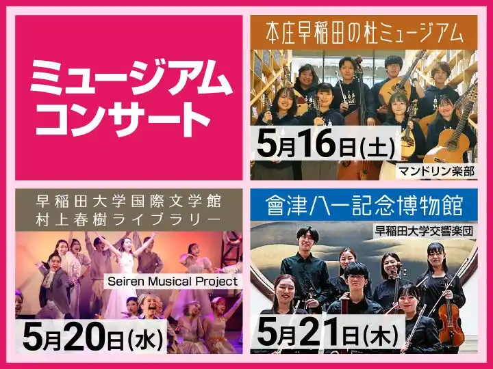 選りすぐりのパフォーマンスサークルが楽しく元気にワセダを盛り上げる「大隈LIVE」、紺碧の空のもと早稲田キャンパスの中心で大迫力のステージをお送りする「Muserum LIVE」、ミュージアムやキャンパスの特別な空間で実力のある早大サークルがコンサートを行う「ミュージアムコンサート」、「西早稲田キャンパスコンサート」など盛りだくさんです。 |