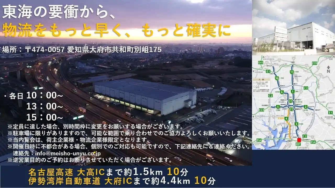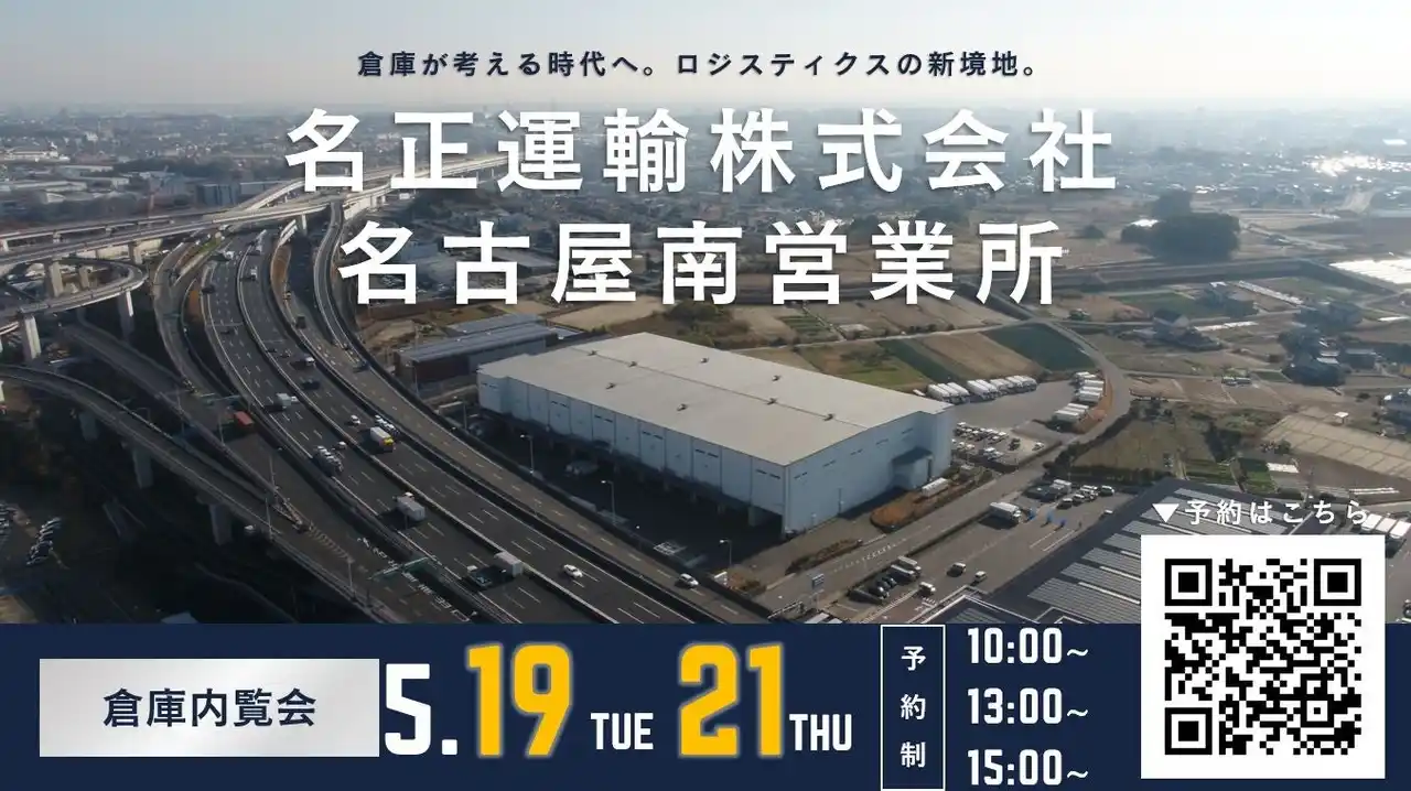 名正運輸株式会社(本社:愛知県飛島村、代表取締役社長:加藤 新一)は、愛知県大府市にある名古屋南営業所にて、荷主・物流企業様向けの倉庫内覧会を開催いたします。 |