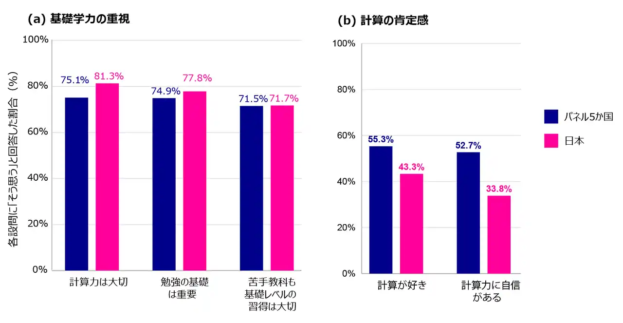 日本の子どもは基礎学力を重視する一方で、自分自身の計算に対する肯定感が控えめであることが明らかになりました。 |
